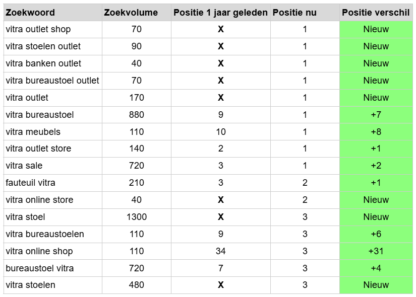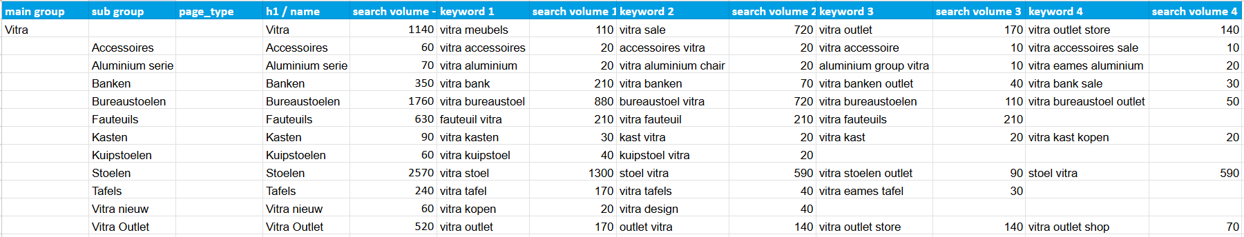 Hieronder een voorbeeld van het zoekwoordonderzoek voor Canoof.nl met focus op het merk Vitra: